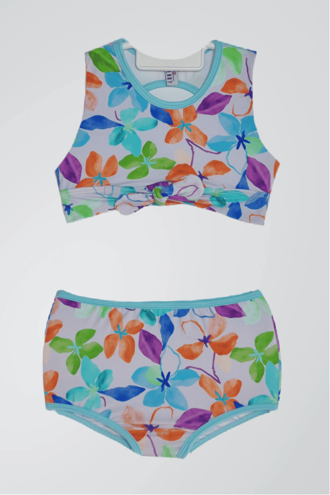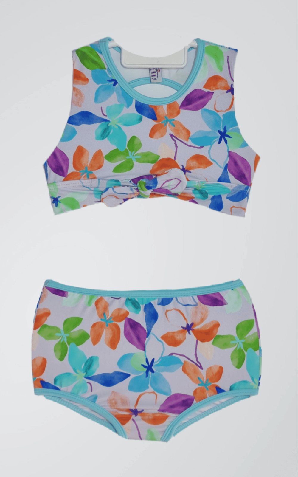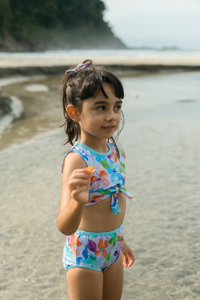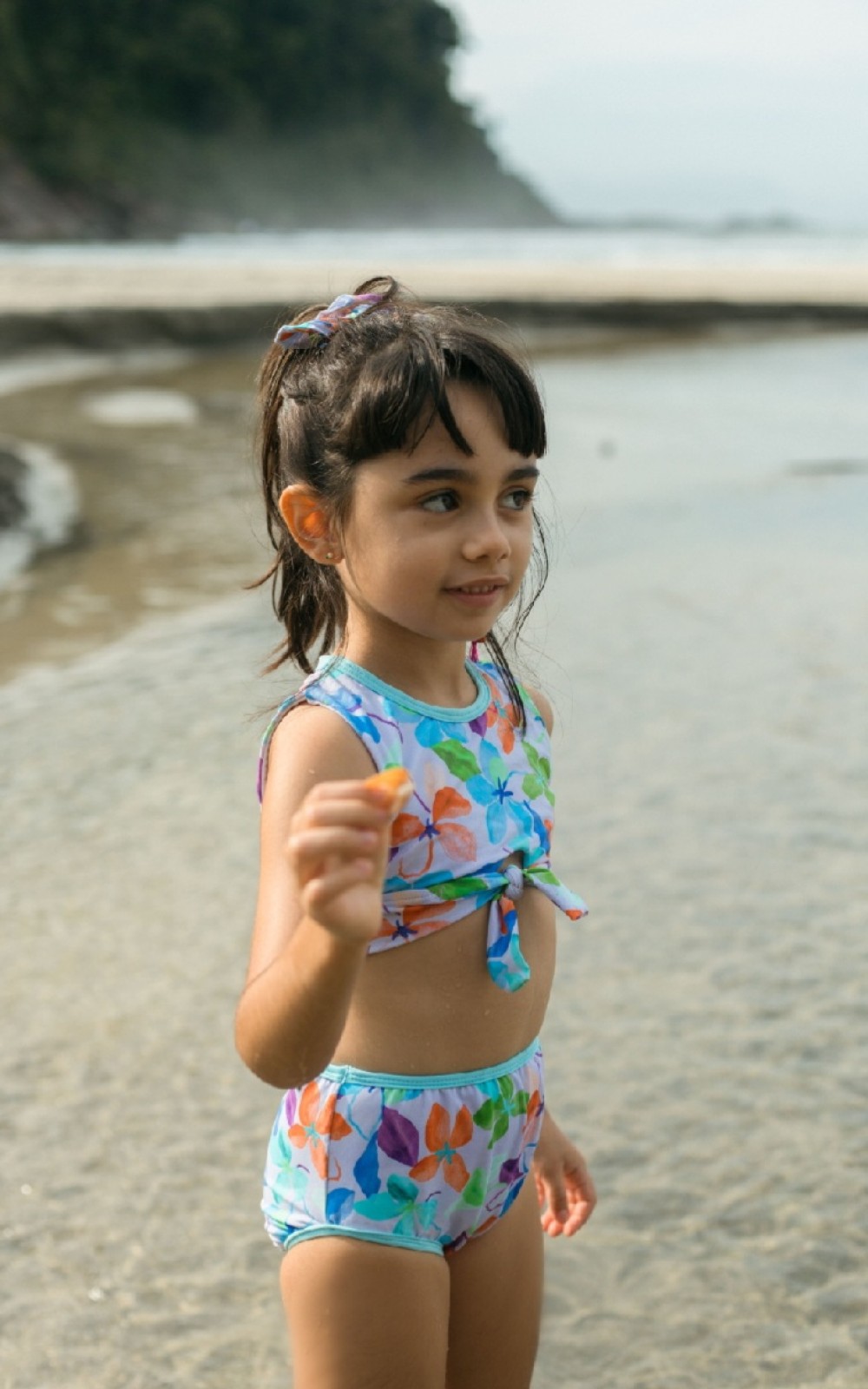Imagine um jardim cheio de flores que acabaram de ser pintadas por sereias! A estampa traz flores coloridas em tons de azul, verde, roxo e laranja, que parecem ter sido pintadas à mão com pinceladas divertidas e leve. O resultado é um desenho alegre e vibrante, que vai deixar as aventuras na praia ou na piscina ainda mais mágicas! A estampa Jardim das Sereias, é ideal para as meninas que querem espalhar alegria e cor nos dias de sol!