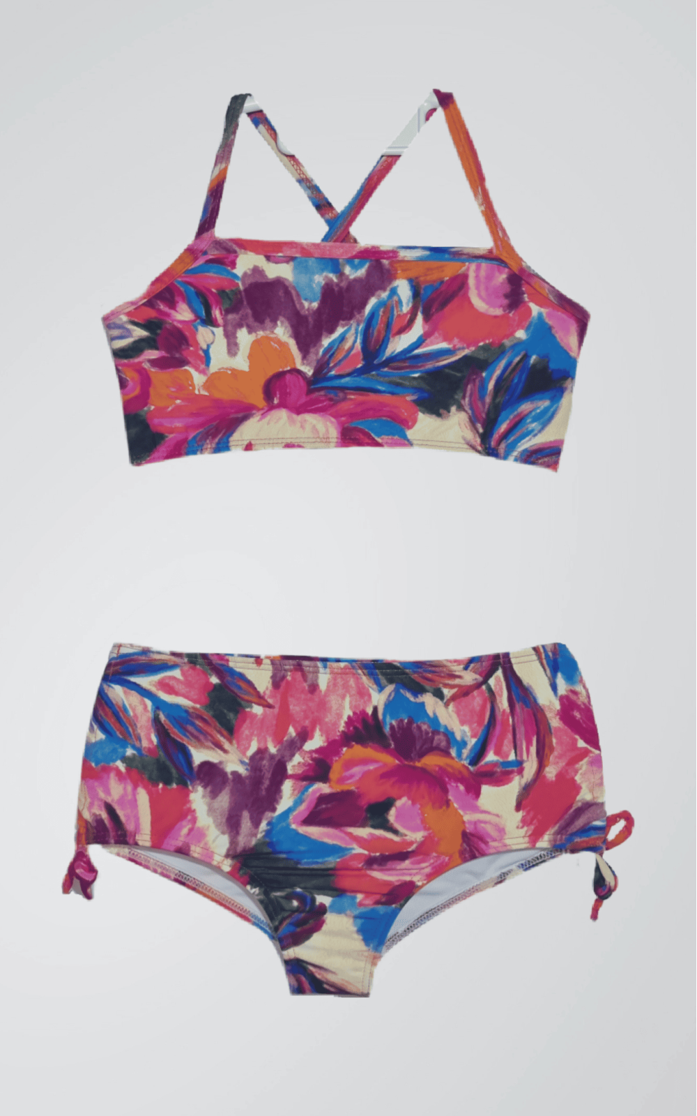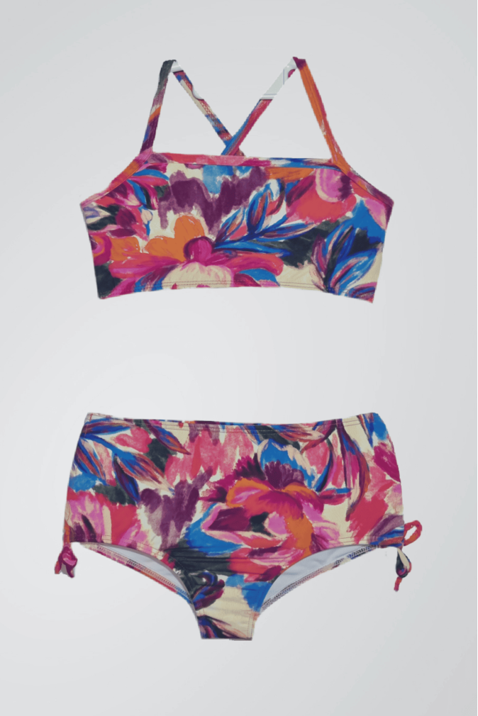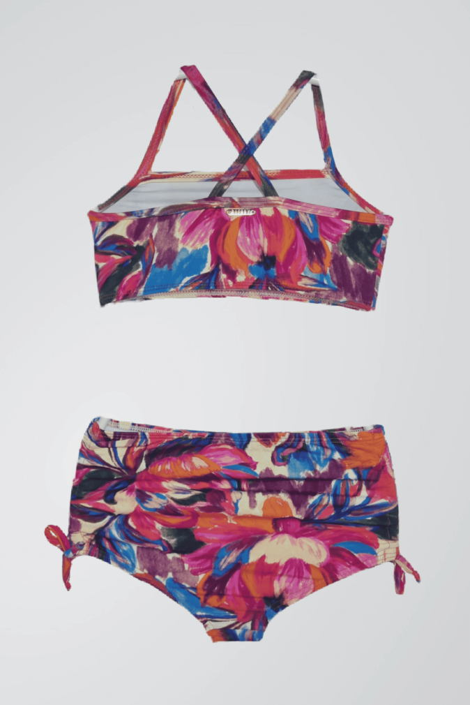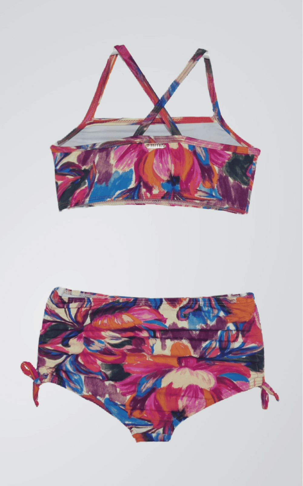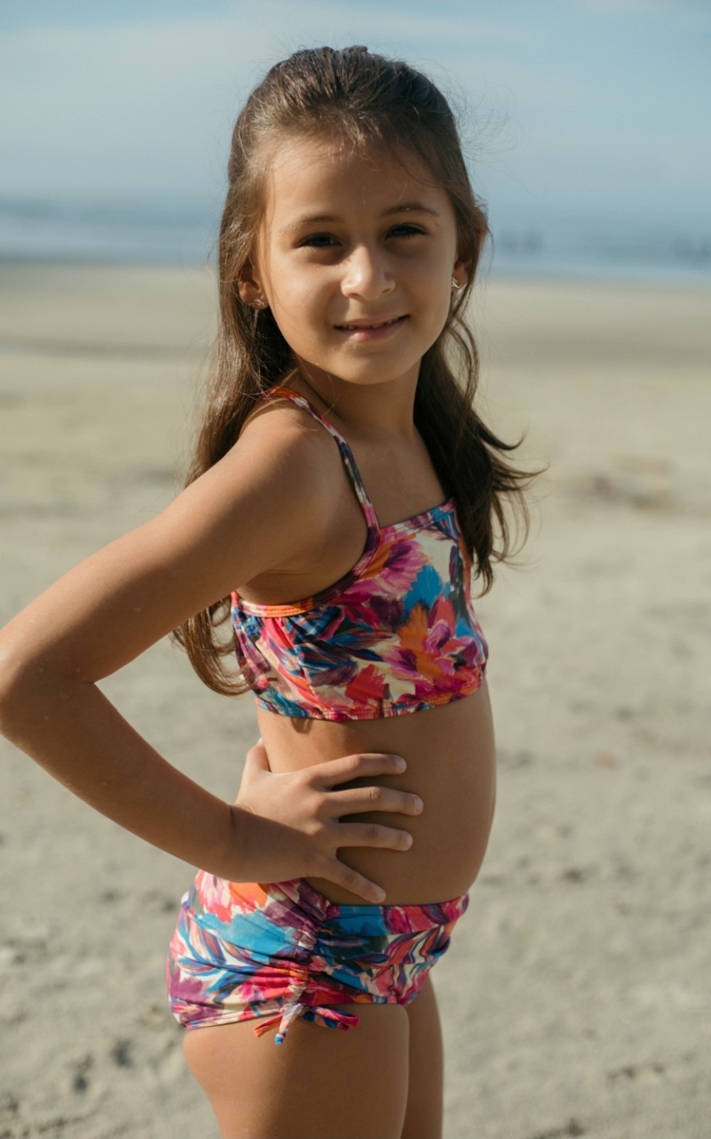 O biquíni Naomi é composto por uma calcinha com detalhe franzido e ajustável nas laterais por meio de laços, permitindo personalizar o ajuste ao corpo, sendo uma escolha perfeita para garantir conforto e estilo para as meninas na praia ou na piscina. O detalhe franzido nas laterais, adiciona um toque charmoso ao design. A calcinha é ampla na parte de trás, garantindo liberdade de movimento para brincadeiras e atividades na água. O top é estilo cropped com decote quadrado. As alças são finas e cruzam nas costas formando um "X", o que oferece um ajuste confortável e seguro para as brincadeiras. O biquíni Naomi é perfeito para unir conforto e estilo para as meninas aproveitarem os dias de sol!
