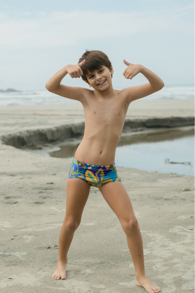 O sungão é uma peça clássica, com modelagem básica, para acompanhar seu menino em todos os momentos, com estilo e conforto. A amarração interna permite regulagem e evita incômodos. Tudo pensado com carinho, para que a sua criança aproveite o verão sem se preocupar com nada, além da diversão.